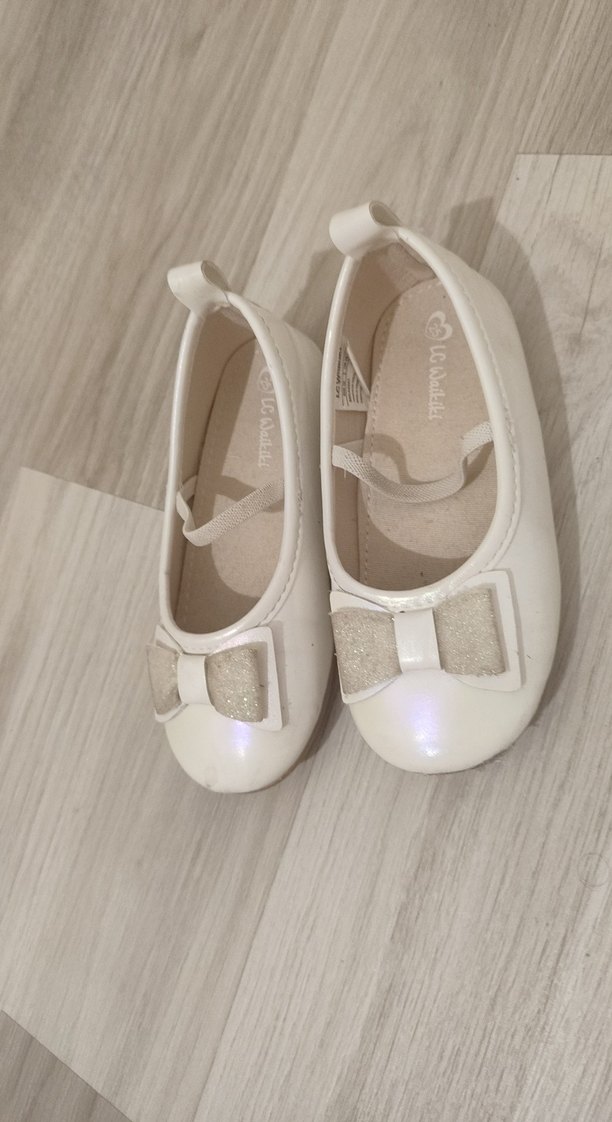 Kız çocuklar için beyaz renkte, fiyonk detaylı ve lastik tabanlı klasik tarzda babetler.