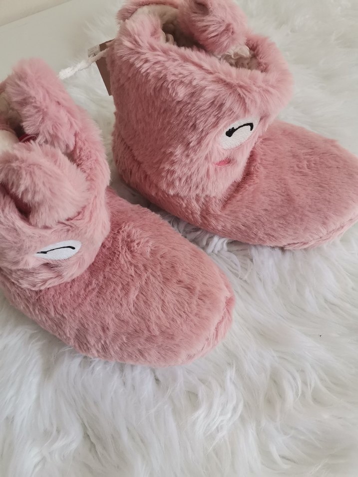 Kız çocukları için yumuşak pembe peluş kumaştan, kürk detaylı ve nakışlı göz desenli sıcak ev botlarıdır.