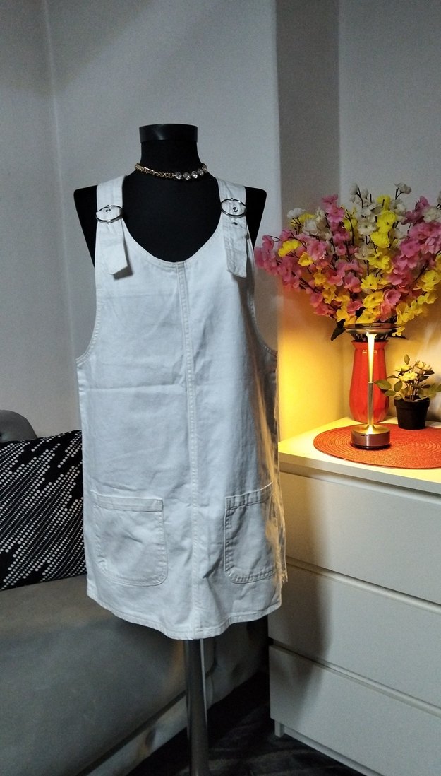 Lcw 40/L beden, koltuk altından eteğe kadar boy ölçüsü 46 cm, üstten ayarlanıyor boy olarak, hiç giyilmesi etiketi üzerinde,Beyaz kolsuz mini jean tulum, halter yaka ve bol kesim. Hafif denim kumaştan, günlük rahat sokak stili için ideal.