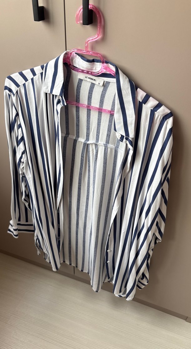 Uzun kollu, V yakalı ve pileli detaylı kadın gömleği. Beyaz ve gri çizgili, sentetik yumuşak kumaştan üretilmiştir. Günlük kullanıma uygundur. Uzun ,uzun kollu lacivert şeritli pazen kumaş ,36 beden fakat kalıp geniş 40 bedene oluyor