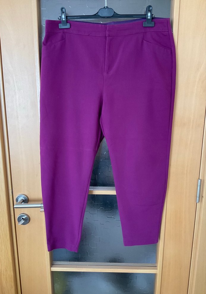 Boy 94cm, iç boy 65cm, bel 47cm. Hasarsızdır. Mor renkte, regular fit ve midi boyda kadın kumaş pantolon. Düz ve parlak yüzeyiyle ofis için rahat ve şık bir seçenek sunar.