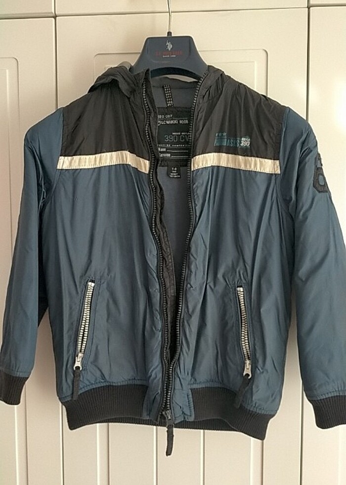 Lacivert tonlarında iyi durumda erkek çocuk mont. 7-8 yaş.