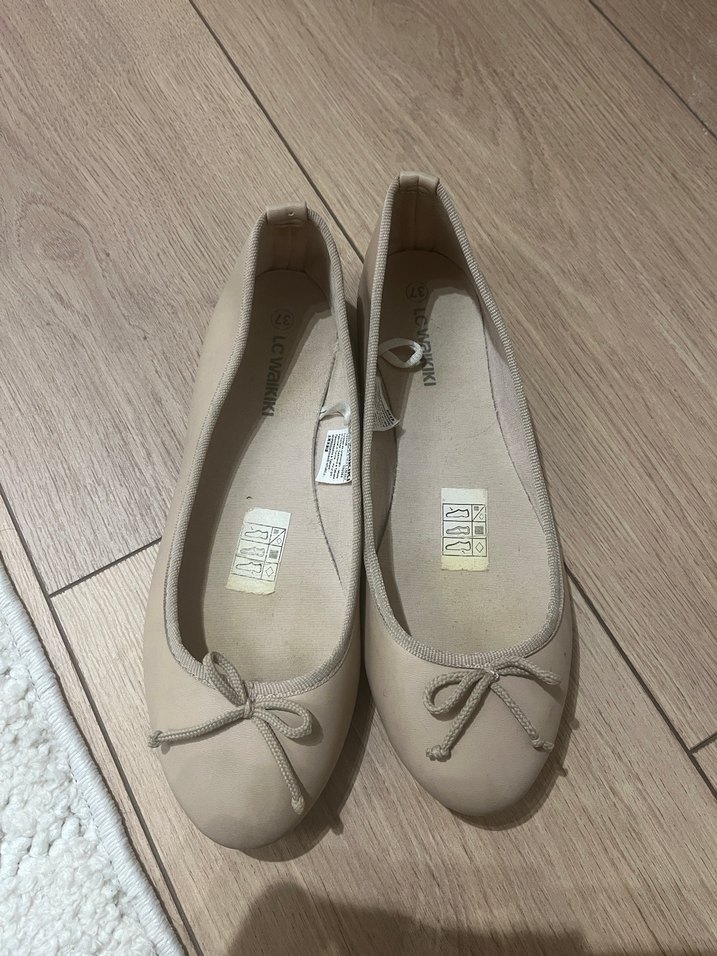 Bej renkli, bağcıklı kız babet ayakkabısı. Lastik malzemeden yapılmış, düz ve normcore tarzda tasarlanmıştır.