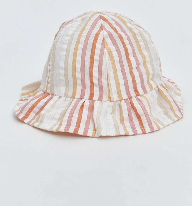 Bohem tarzda, çok renkli hafif çizgili tekstil malzemeden yapılmış pliseli çocuk şapkası, temiz 6-18 ay