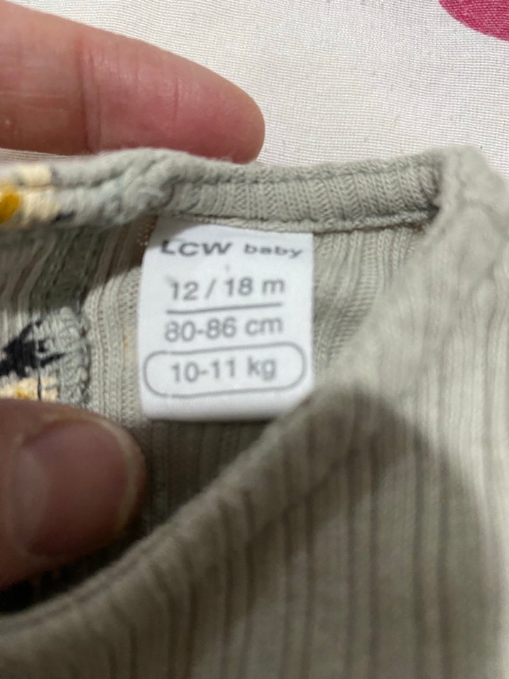 LCW Baby markalı, baskılı desenli gri bebek önlüğü 12-18 ay, 80-86 cm ve 10-11 kg bebekler için uygundur.