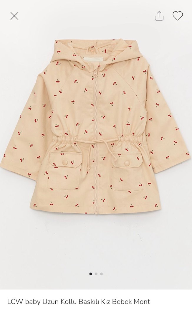 Bej renkli, kapüşonlu kız bebek montu, nakışlı desene ve düğmeli ceplere sahiptir. Rahat kesimi ve yumuşak sentetik kumaşına sahiptir.5-6 yaş temiz sorunsuz mevsimlik mont.