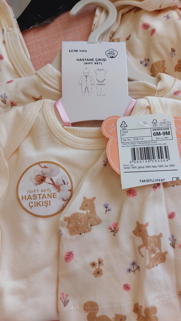 Krem renkli, küçük hayvan ve çiçek baskılı askılı bebek body. Yuvarlak yaka, 6-9 ay arası bebekler için uygundur. LCW Baby hastane çıkışı hediye seti parçası.