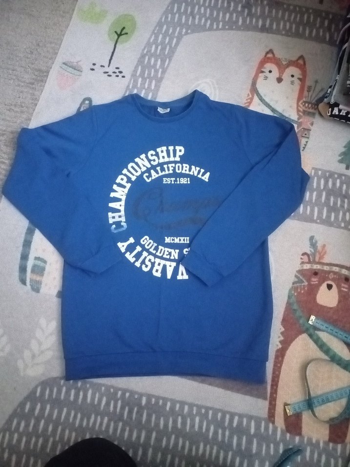 Mavi, uzun kollu, yuvarlak yaka sweatshirt. LCW marka, içi elyaflı değil orta kalınlıkta, sayılı giyildi hiç sıkıntı yok,en 46 boy 64 cm, etiket 12 yaş
