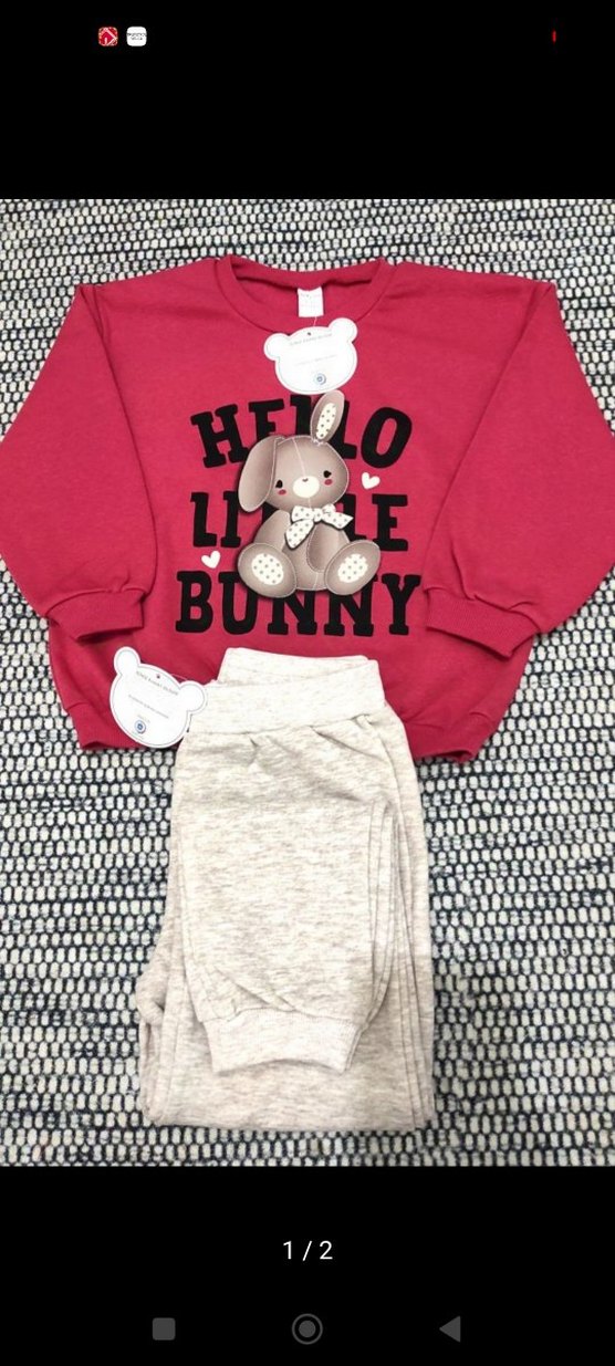 Bordo uzun kollu üstü baskılı tavşan ve "BUNNY" yazılı, yumuşak gri örme pantolonlu bebek kız takımı. 5_6 yaş 3 iplik şardonlu.