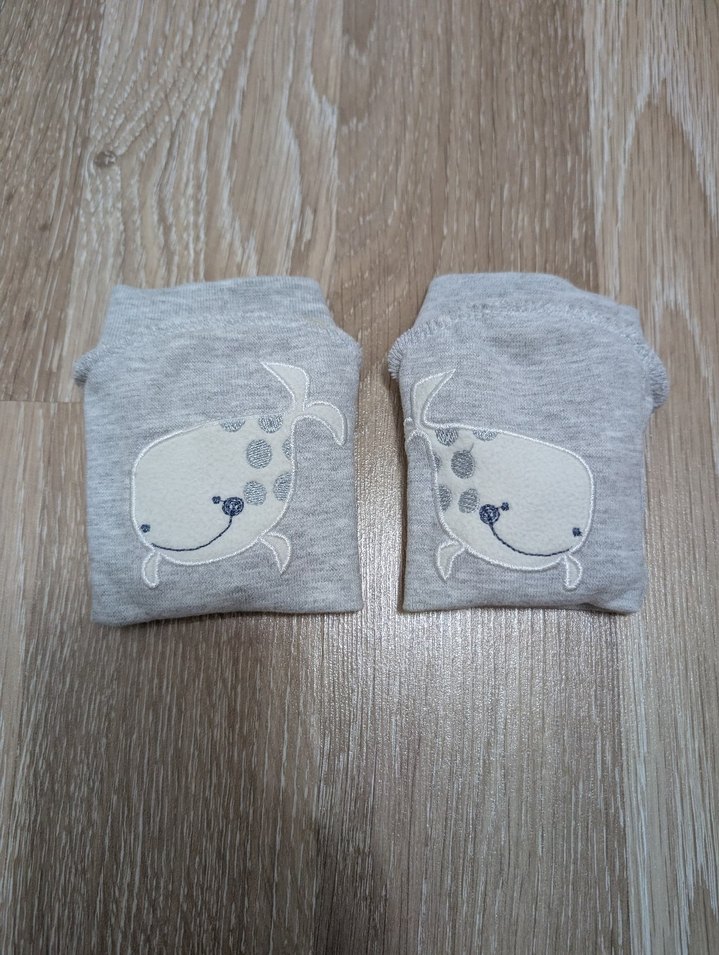 Gri bebek emekleme dizliği. Oğluma dar geldiği için hiç kullanmadık. Yumuşak örme kumaştan, balina baskılı.