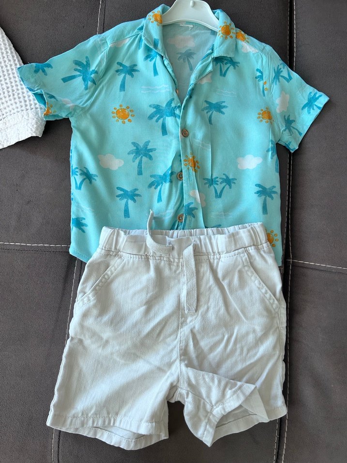 Ufak belli belirisz lekeler mevcuttur.Pastel tonlarda, düğmeli ve yakalı kısa kollu gömlek ile beyaz pamuklu şorttan oluşan bebek erkek takımı.