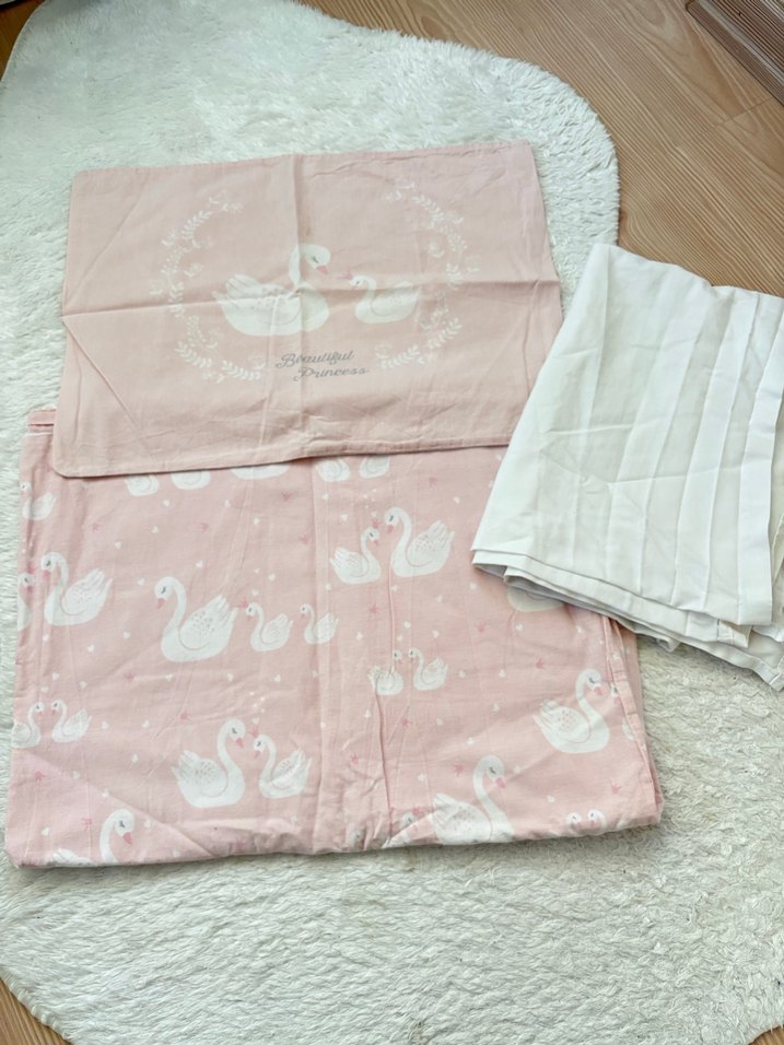 Pastel pembe renkte, pamuklu kumaştan yapılmış, kuğu desenli çocuk uyku setidir. Yastık kılıfı, yorgan ve beyaz bez içerir.