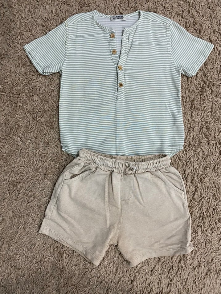 Pamuklu, kısa kollu, düğmeli çizgili üst ve bej şortlu bebek erkek takımı. Yakası yuvarlak ve sade tarzda. Gömlek müslindir. Şortta çok çok az ütüden dolayı renkte açılma var