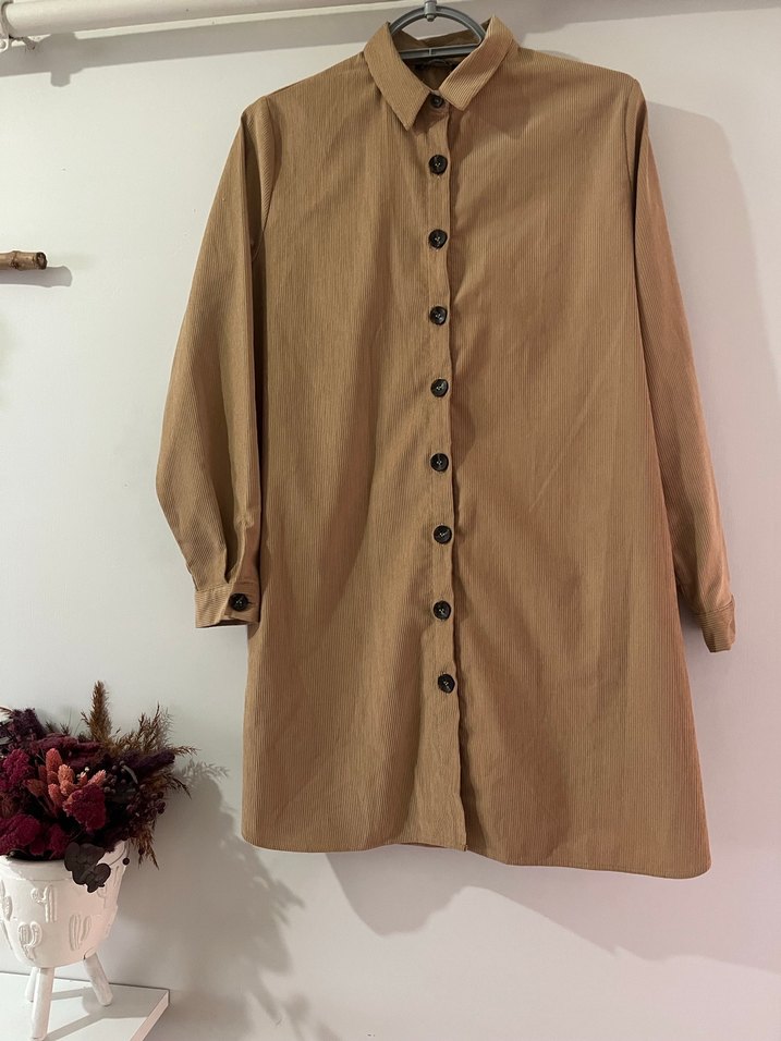 Bej renkli, düğmeli ve uzun kollu kadın gömleği. Yumuşak keten kumaştan, bol kesim ve midi boyda, günlük rahat sokak stili için uygundur. Parlak tonu ile sade bir şıklık sunar. Boy 85 cm göğüs 53 cm