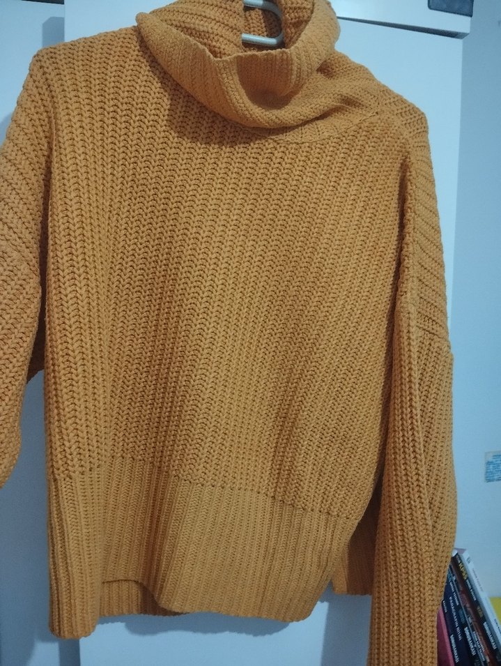 Bej renkli, örgü kumaştan yapılmış, boğazlı ve uzun kollu, rahat kesimli midi uzunlukta kadın kazak.