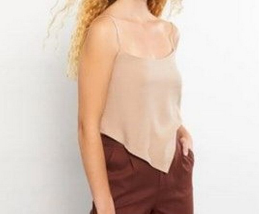 Bej renkli, V yaka, kolsuz kadın crop. İnce, ketenimsi kumaştan, kısa ve salaş kesimle günlük kullanıma uygun minimal tasarım.