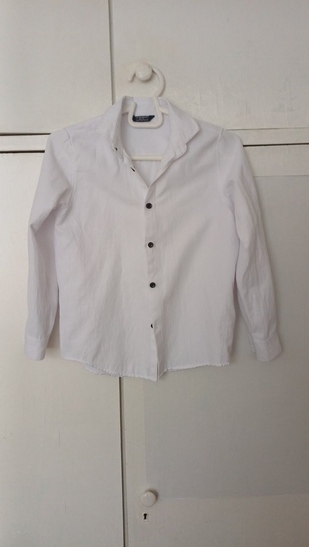 Beyaz sik kumaştan yapılmış, düğmeli ve yakalı erkek çocuk gömleği. Uzun kollu ve regular fit kesimle sade bir görünüme sahiptir. 1 defa giyilmistir