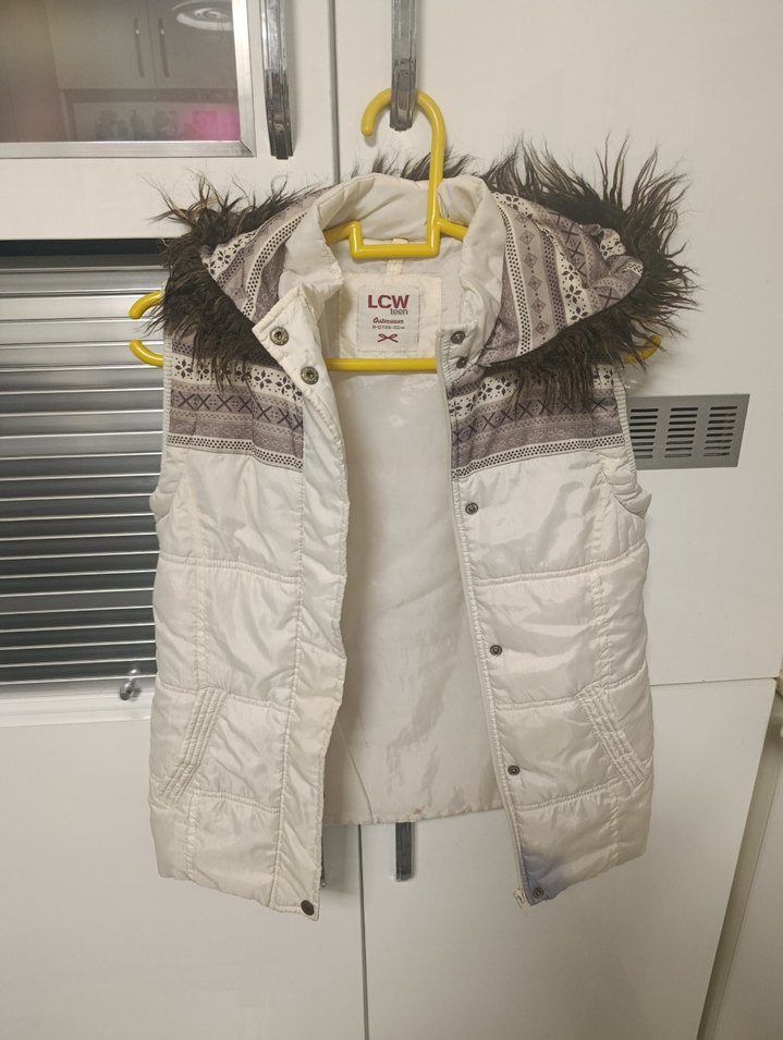 LCW markalı, beyaz ve gri tonlarda, kürklü detaylı, yakalı ve kolsuz yeleki. Sentetik kumaştan, rahat kesimli, günlük sokak tarzına uygun.