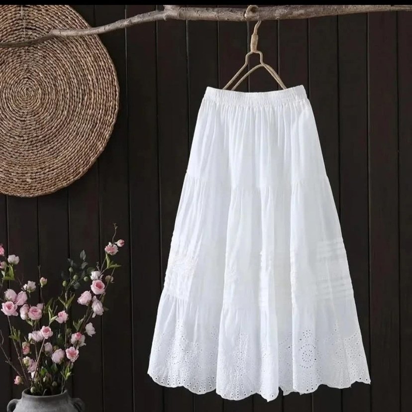 Pamuklu kumaştan yapılmış, nakışlı desenlere sahip, fırfır detaylı beyaz uzun etek. Bohem tarzı için uygundur. tertemiz bir kez giyildi. astarli iç göstermez.