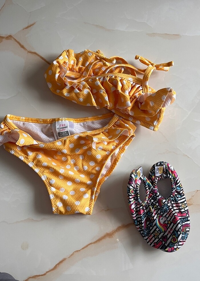 6-9aylık kız çocuğu bikini takımı ve deniz ayakkabısı Bikini altı Tertemiz bezinin üstüne kullanıldı. Çok az kullanıldı.