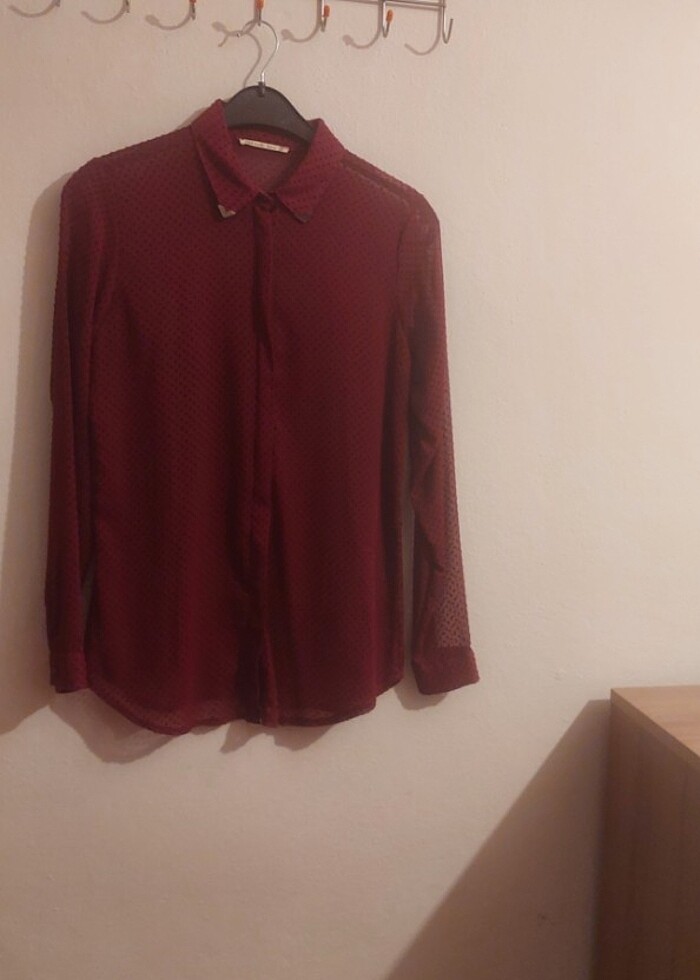 Lcw marka bordo renkli gömlek. 2 - 3 defa giyildi. Kumaşının iç gösteren yapısı var (2. Fotoğrafta belli )