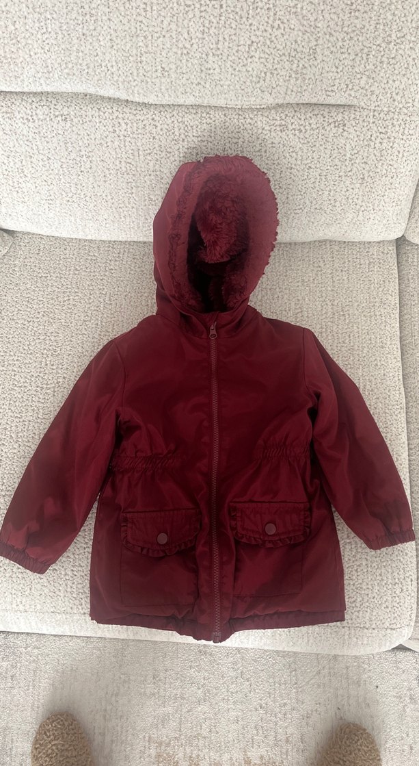 Bordo renkli, kapüşonlu ve kürklü detaylı kız çocuk montu, sıcak tutan yumuşak kumaştan ve dar kesimlidir. 3-4 yaşa uygundur kalıbı geniştir