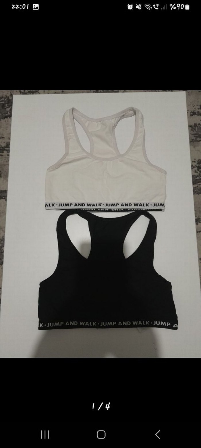 Beyaz ve siyah renklerde, baskılı ve kısa kesim, sırt kısmı racerback spor sütyenleri, etek kısmında 'JUMP AND WALK' yazısı bulunur. ♀️