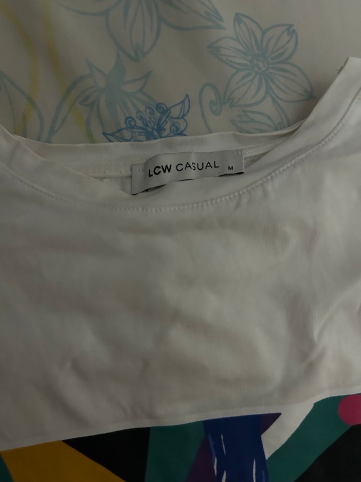 LCW Casual markalı beyaz kadın tişörtü, kısa kollu ve salaş kesimlidir. Kayık yaka, baskılı desen ve düğme detayları bulunur. Yumuşak sentetik kumaştan üretilmiştir. 1-2 kez giydim