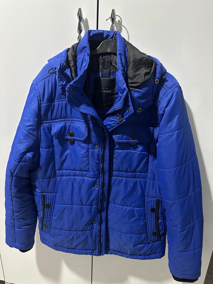 Erkek mavi mont, uzun kollu ve Yumuşak ve sıcak kumaştan, günlük sokak stiline uygun.