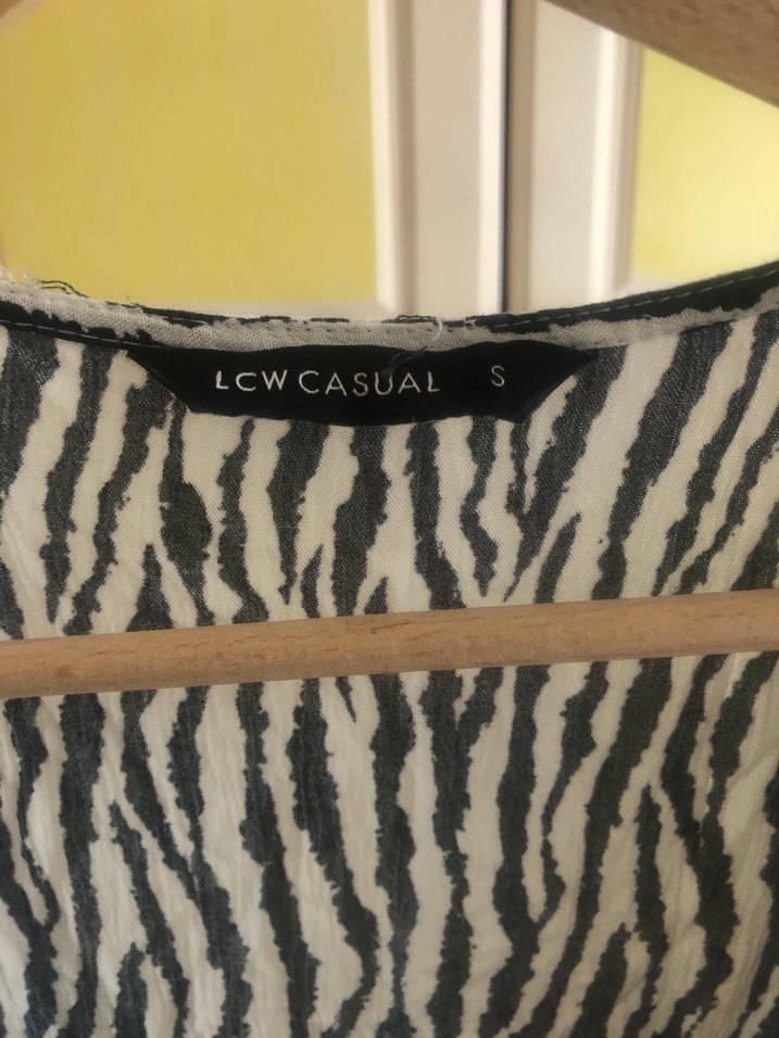 LCW Casual markalı, gri zebra desenli kadın elbise. Çizgi detaylı, v yaka ve düşük kollu, rahat kesim midi boyda sentetik kumaştan.