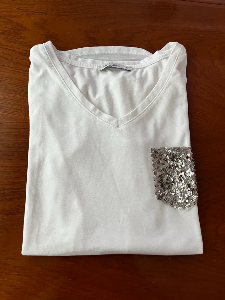 Ürün bir iki kez giyildi çok temiz beyaz V yaka, kısa kollu, pamuklu tişört. ve payetli cep detayıyla günlük kullanıma uygun.