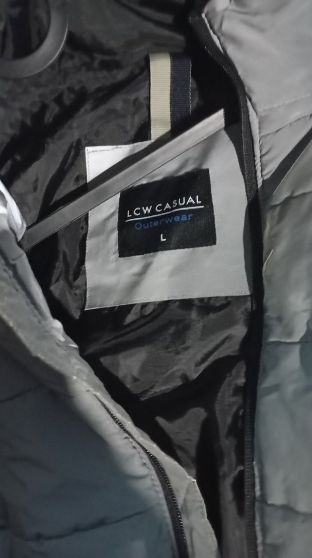 LCW Casual markalı siyah ve gri renklerde, sokak tarzı erkek mont. İç etikette büyük beden olduğu belirtilmiştir.