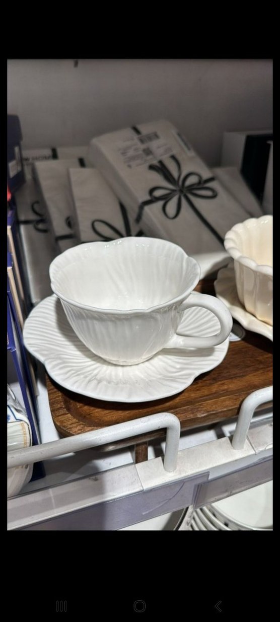 Beyaz seramikten yapılmış, dalgalı kenar tasarımıyla sıcak içecekler için uygun fincan ve tabak seti. ☕