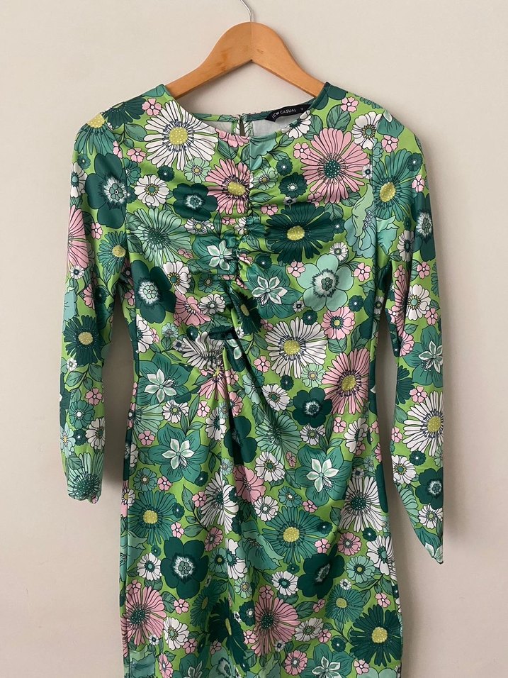 Uzun kollu, drapeli, çiçek desenli bohem elbise. V yakalı, mini boy, yumuşak sentetik kumaştan günlük kullanıma uygun. Aldım hiç kullanmadım