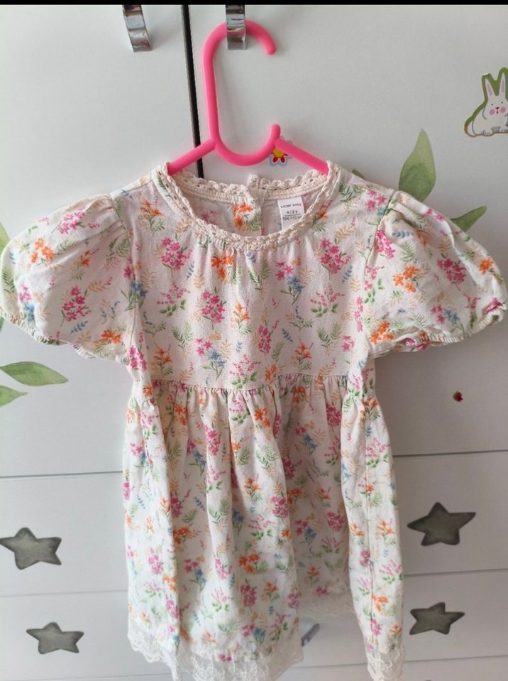 Pamuklu, kısa kollu, bol kesim kız elbisesi. Pastel çiçek desenli, dantel detaylı ve bisiklet yaka ile bohem tarzda. 4-5 Yaş