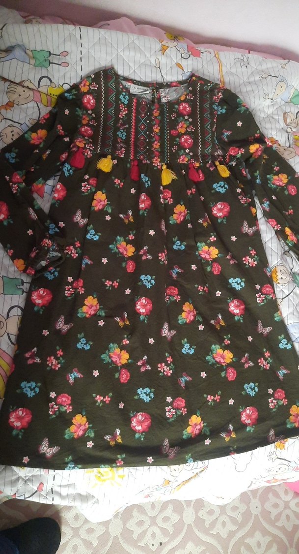 Koyu renkli, çok renkli çiçek desenli, bol kesim kız elbisesi. Uzun kollu ve V yaka, bohem tarzını yansıtıyor. 9.10 yaş, flanel kumaş, kışa uygun, temiz, sorunsuz