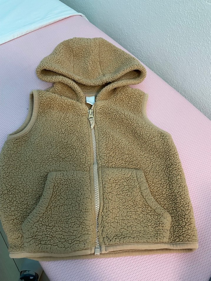 Kahverengi, yumuşak ve sıcak kumaştan fermuarlı, kapüşonlu yelek sıcacık tutuyor deformesi yok ve temizdir 18/24 ay ama 2,5 yaşa kadar olur