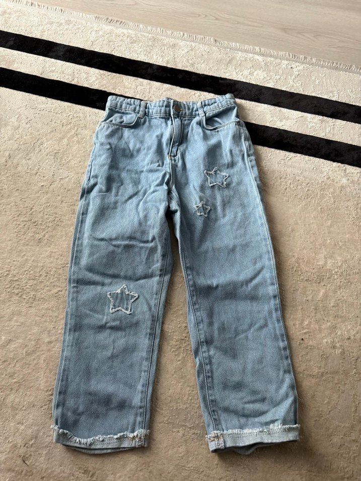 Mavi tonlarında, gevşek kesim ve normal boyda denim jean. Sokak stiline uygun, yıldız desenli ve kemerli, günlük kullanıma uygun.Sıfır gibi sorunsuz