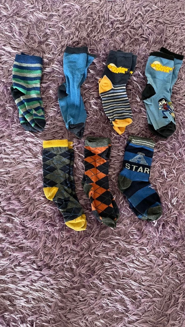 Erkek çocuklar için çeşitli renkli desenlere ve koyu canlı tonlara sahip çorap seti, çizgili ve baklava desenleri içerir. 27-30 numara