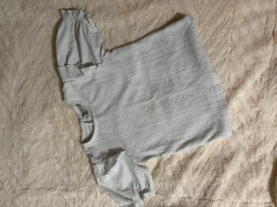 Beyaz renkli, kısa kollu ve kayık yaka olan bu örme bluz, işlemeli dantel detaylara sahiptir. Bol kesim ve kısa boyda, bohem tarzındadır.az kullanıldı kırık beyaz rengindedir