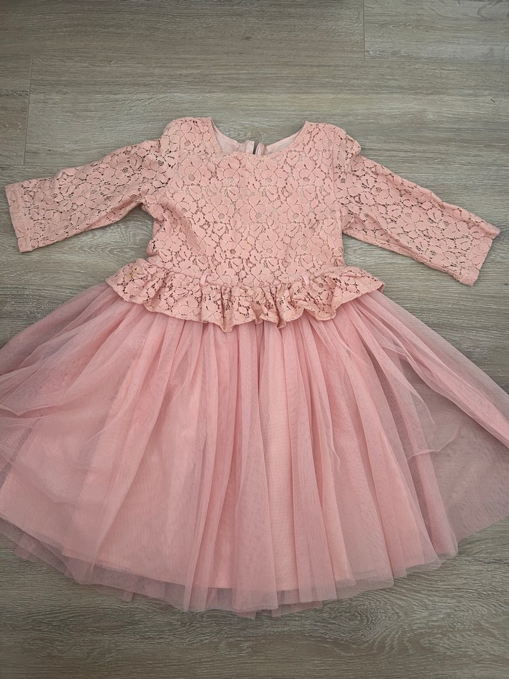 Dantel detaylı, uzun kollu, pembe kız çocuk elbisesi. Üst kısmı triko, bohem tarzda, etek kısmı tül ve belde fırfırlı.8-9 yaş.