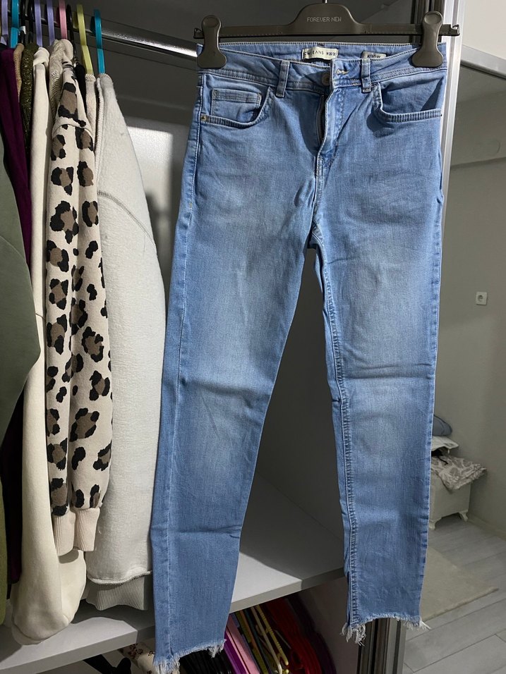 Mavi denim kumaştan, normal boyda, dar kesim normal bel kadın jean. Paçaları kendinden modelli hafif yırtık. Bir kere giyildi bedeni olmadı