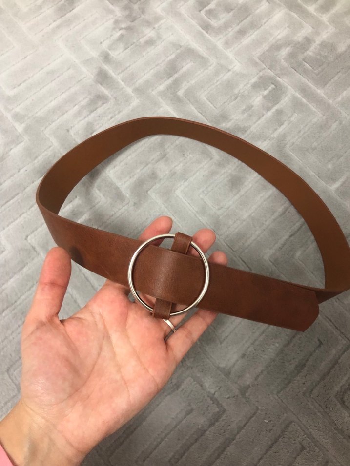 Yuvarlak gümüş tokalı, kahverengi deri kemer. Minimalist ve bohem tarzı yansıtan, retro dokunuşlu kadın kemeri. Hakiki deri değildir.