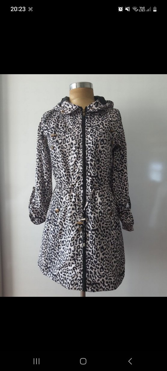 Gri leopar desenli, düğmeli, normal boy midi kadın yağmurluğu. Uzun kollu, kesimli ve notched yaka detaylıdır. Sentetik kumaştan üretilmiştir. ☔