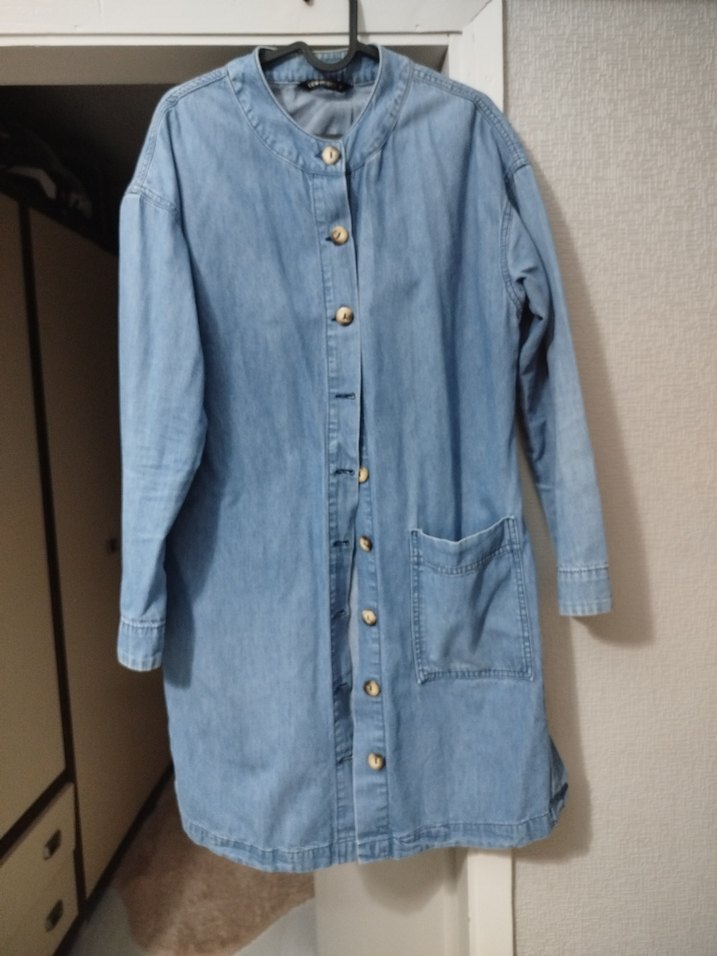 Pastel mavi renkte, düğmeli ve uzun kollu midi boy bol kesim denim ceket, günlük sokak stili için uygundur. temiz kullanılmıştır