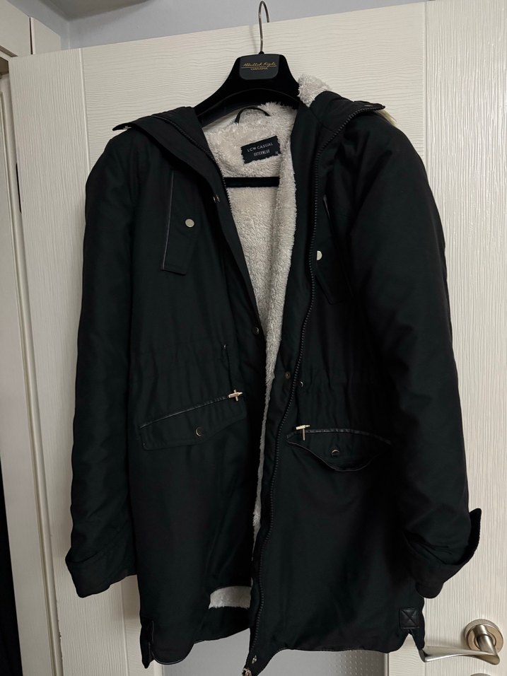 Düğmeli siyah kadın midi mont, rahat kesim ve notalı yaka ile. Uzun kollu, yumuşak ve sıcak iç kumaşa sahip, günlük kullanım için ideal.