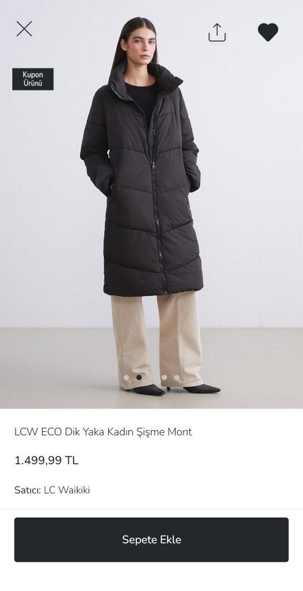Uzun, koyu kadın mont, dik yakalı ve uzun kolludur. Sentetik kumaştan üretilmiş olup, rahat kesimi ve gündelik kullanıma uygun normcore tarzıyla dikkat çeker.