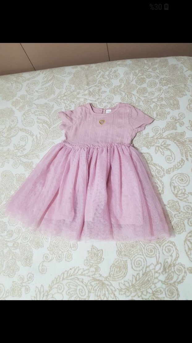 Pembe, kısa kollu, yuvarlak yaka, dantel işlemeli, bol kesim kız çocuk elbisesi. Yumuşak sentetik kumaştan, bohem tarzda.