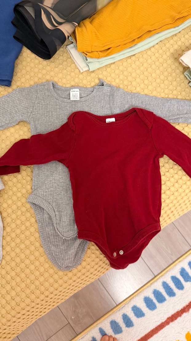 Gri renkli, uzun kollu, triko örgü yün kumaştan yapılmış, yuvarlak yakalı, desensiz normcore tarzda bebek body. 1-2 detay giydirebildim