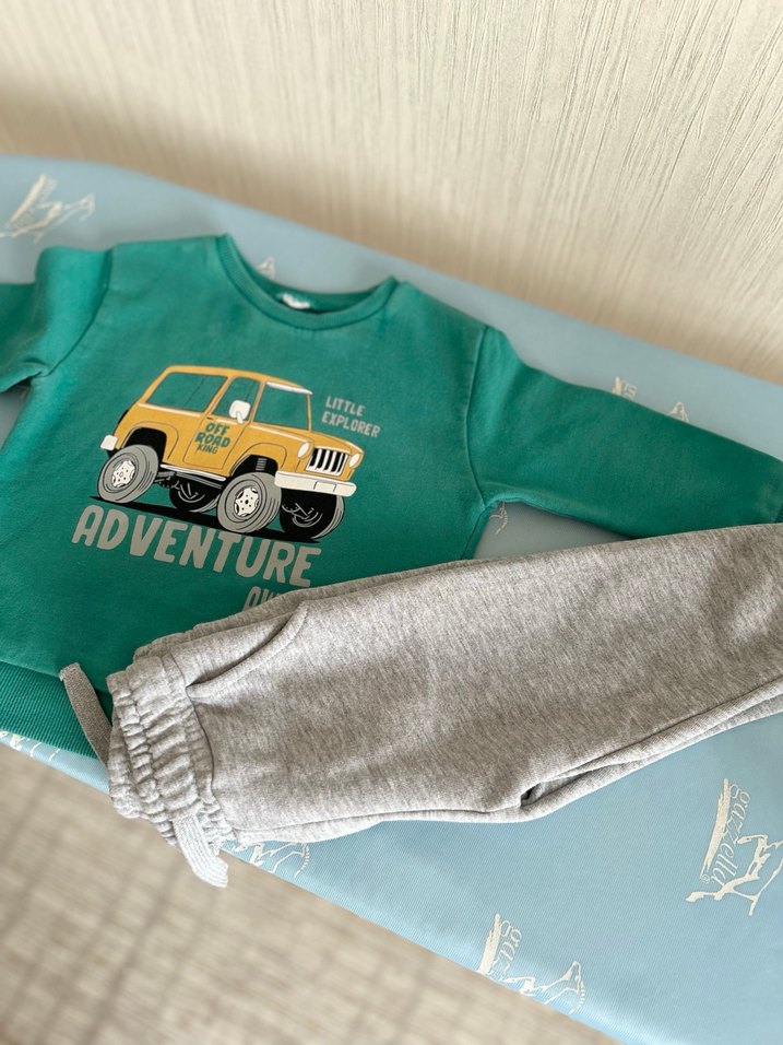 Uzun kollu yeşil sweatshirt üzerinde macera temalı baskı ve "ADVENTURE" yazısı bulunur. Yumuşak, örme gri pantolon lastikli bel ile rahatlık sağlar. 12-18 ay